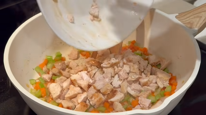 Once thick, stir in your cooked chicken, mixed vegetables, garlic powder, salt, and pepper. Simmer for a couple of minutes so all the flavors blend.