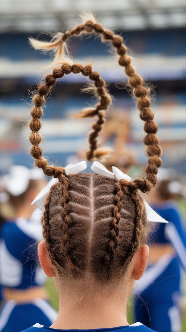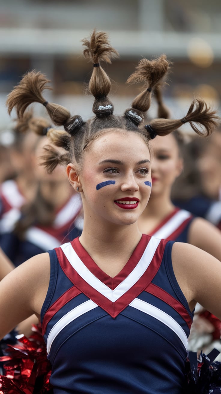 Space buns are a fun and playful hairstyle for cheerleaders with medium to long hair. To create space buns, part your hair down the middle and twist each section into a bun on the top of your head. Secure the buns with bobby pins and leave a few pieces of hair loose for a relaxed look. This hairstyle is perfect for adding a touch of whimsy to your game day look.