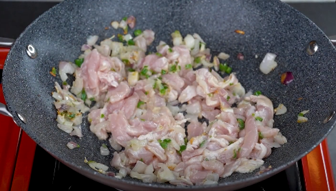 In a large pan, heat some oil or butter. Add chopped onions and sauté until golden. Toss in garlic and let it sizzle for a few seconds. Now add your chicken pieces with a pinch of salt and pepper. Cook until the chicken is no longer pink.