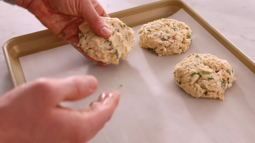 Scoop out portions and shape them into round cakes. I usually make them about 2–3 inches wide and 1 inch thick. Place them on a tray and chill in the fridge for 15 minutes. This helps them firm up so they don’t fall apart in the air fryer.