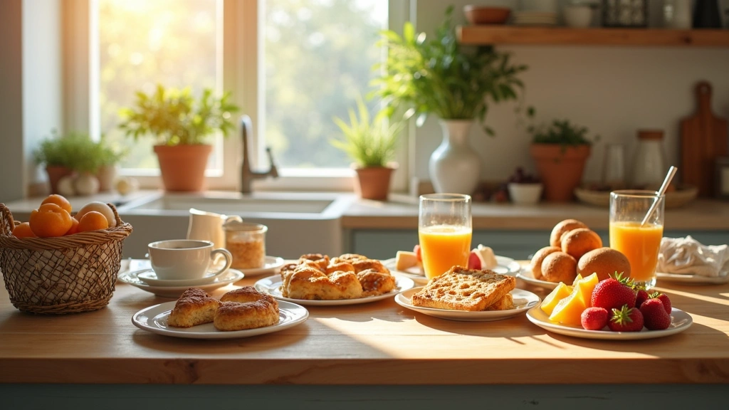Utilize a small table with comfortable seating, adorned with soft cushions and throws. Set up a selection of easy-to-prepare breakfast items like oatmeal and smoothies for a quick and nourishing start to the day.