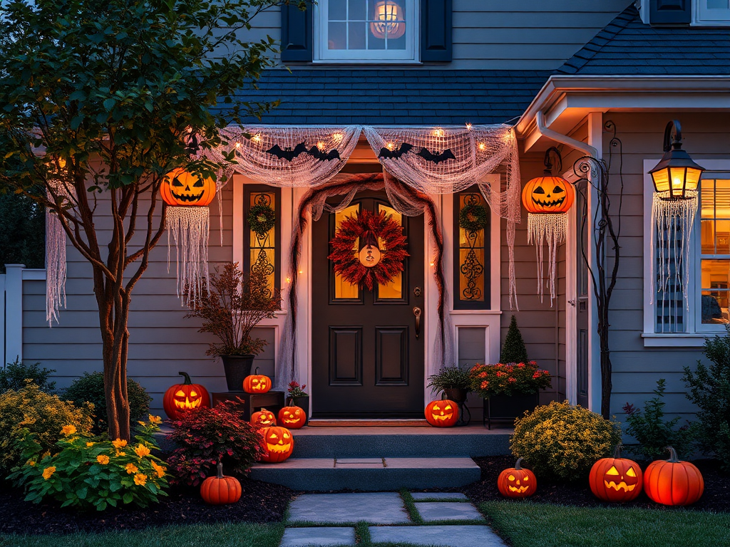 Light up your front walkway with a pumpkin lantern display that will guide guests to your door. Carve out mini pumpkins and place LED tea lights inside for a spooky glow. Line the walkway with the pumpkin lanterns, along with some fall foliage or hay bales for added ambiance. Your guests will love walking through this magical pumpkin pathway on Halloween night.