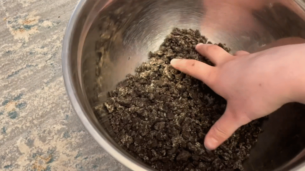 Place all the Oreos into a food processor and blend until they turn into fine crumbs. No big chunks—you want a sand-like texture. If you don’t have a food processor, just put them in a zip-top bag and crush them with a rolling pin.
