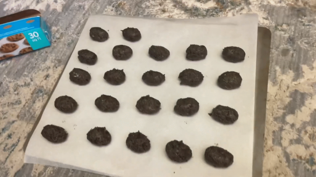 Scoop out small portions (about 1 tablespoon each) and roll them into smooth balls. Place them on a baking sheet lined with parchment paper.