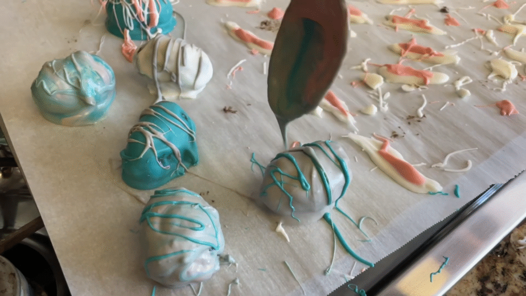 - Pastel drizzle – Melt pink, yellow, and purple candy melts, then drizzle over the truffles in thin lines.