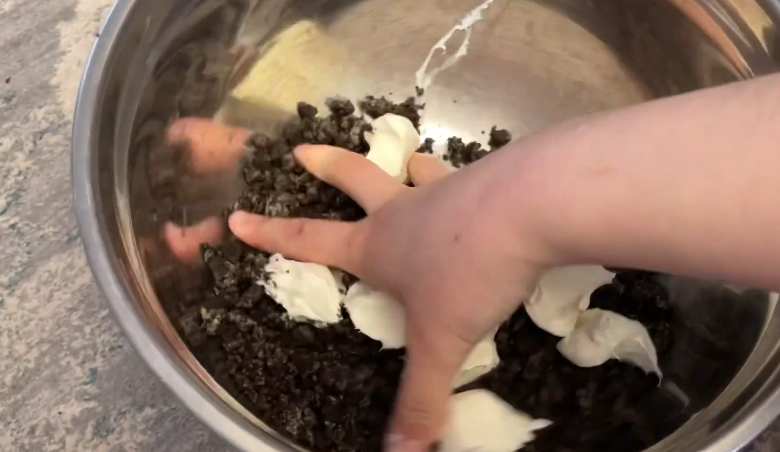 Pour the Oreo crumbs into a bowl and mix in the softened cream cheese. Stir until it forms a smooth dough-like mixture. This step is what gives the truffles their creamy texture.