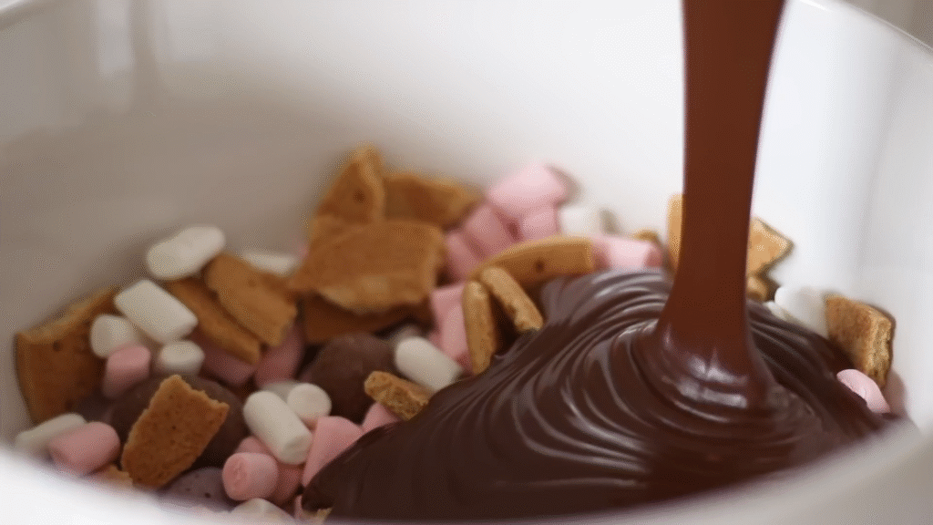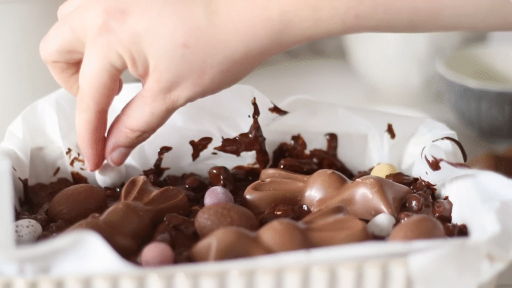 Once the chocolate is melted, stir in your marshmallows, crushed biscuits, and a handful of Easter candies. I usually save a few candies to sprinkle on top later so it looks extra festive.