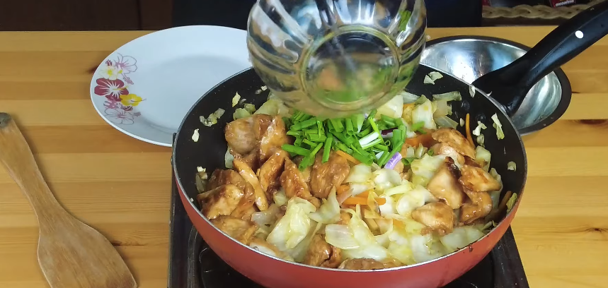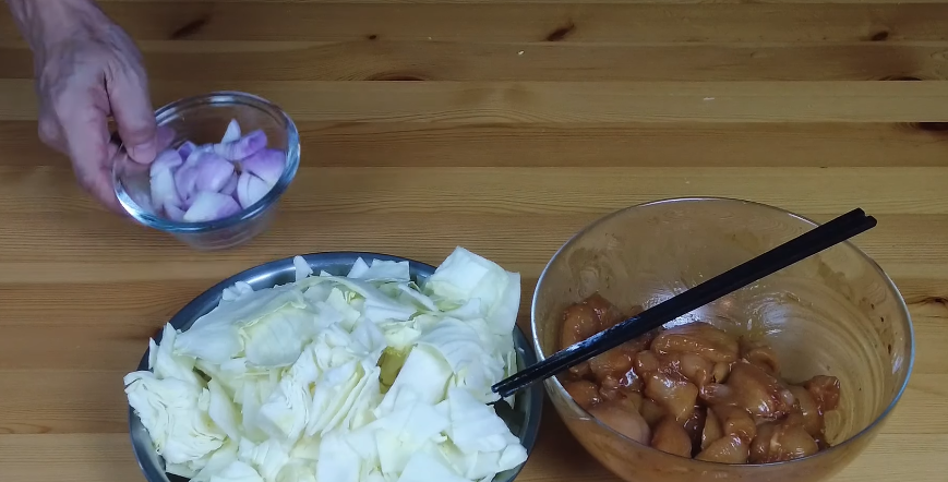 Cut your chicken into thin strips so it cooks fast. Shred the cabbage and slice the onion. Having everything ready makes stir-frying way easier.