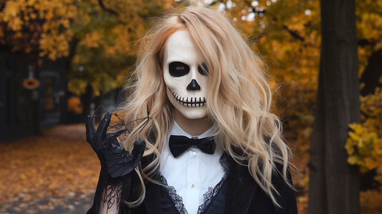 If you want a more edgy Halloween hairstyle, why not try the skeleton chic look? I like to create a sleek middle part and straighten my hair, then add some white temporary hair color and draw on some skeleton details with black eyeliner or face paint. Pair it with a black outfit and some bold accessories for a chic and spooky look.