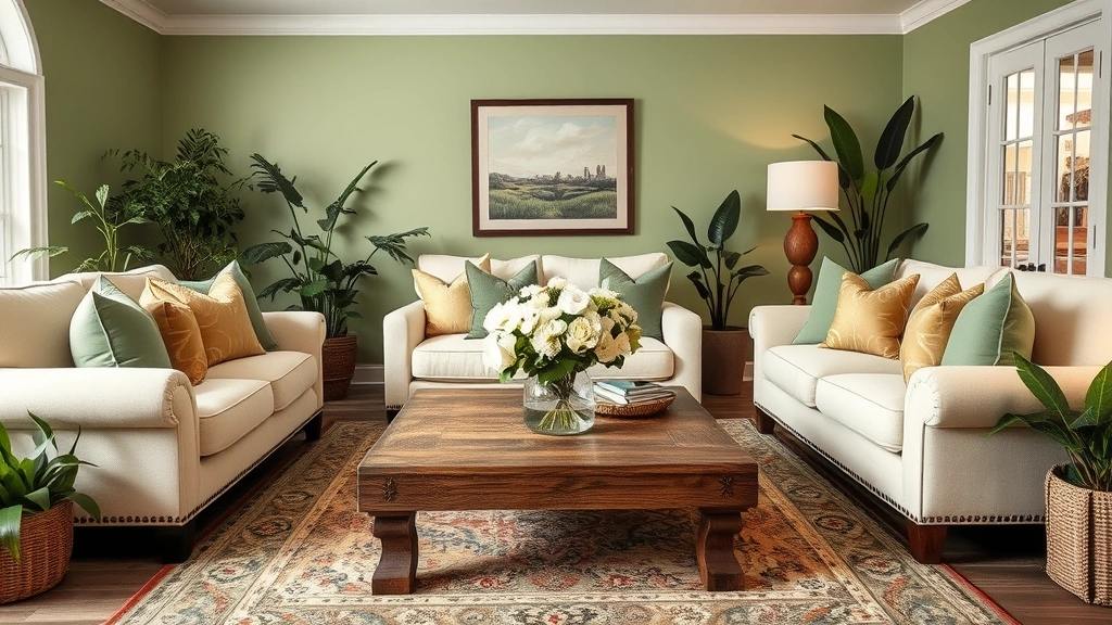 Incorporate accessories like an intricately patterned sage green throw blanket draped over a plush sofa, alongside various textured cushions that invite you to sink in.