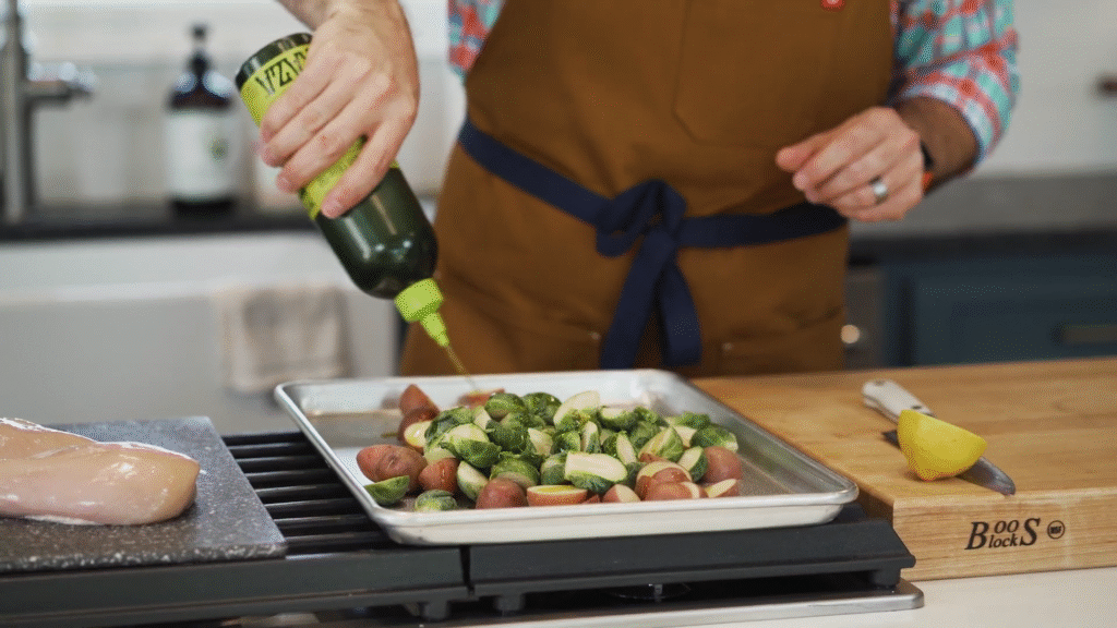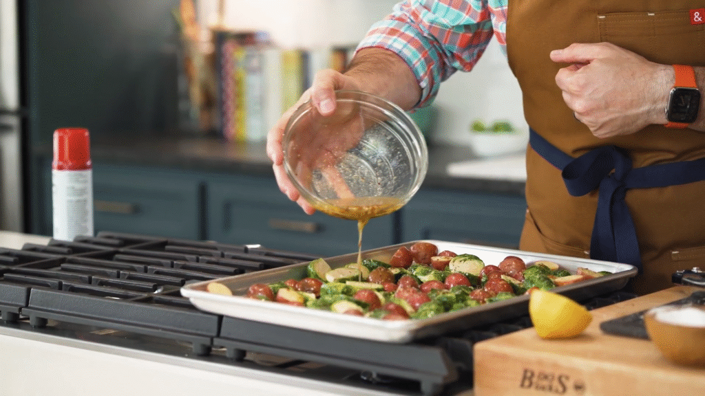 Cut your vegetables into even pieces so they cook evenly. Toss them with olive oil, garlic, and a little lemon juice, then spread them on the sheet pan.