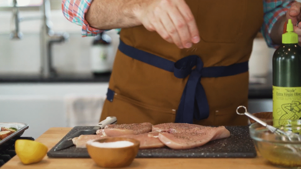 In a bowl, mix olive oil, lemon juice, garlic, salt, pepper, and herbs. Coat the chicken in this mixture. Even 15 minutes of marinating makes a big difference, but if you have time, let it sit longer.
