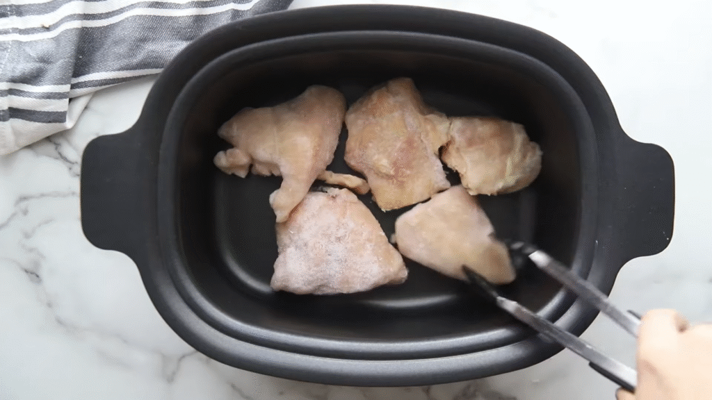 - Layer the chicken – Place the chicken at the bottom of your slow cooker.