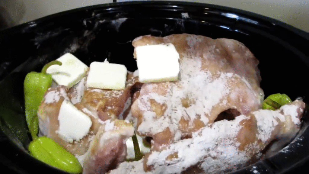Cut the butter into slices and place it over the chicken. Then add the pepperoncini peppers on top. If you want it spicier, add a little juice from the jar.