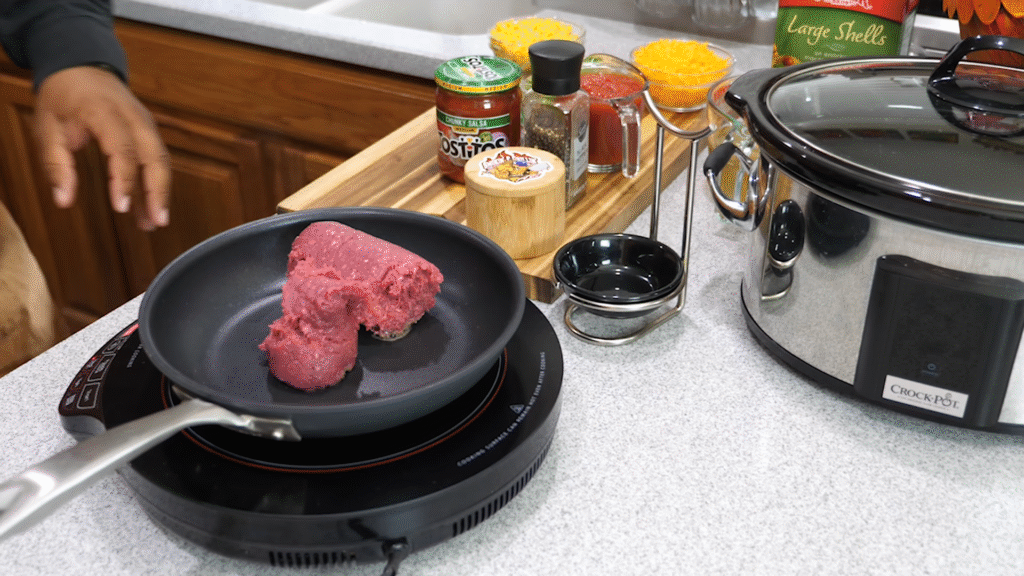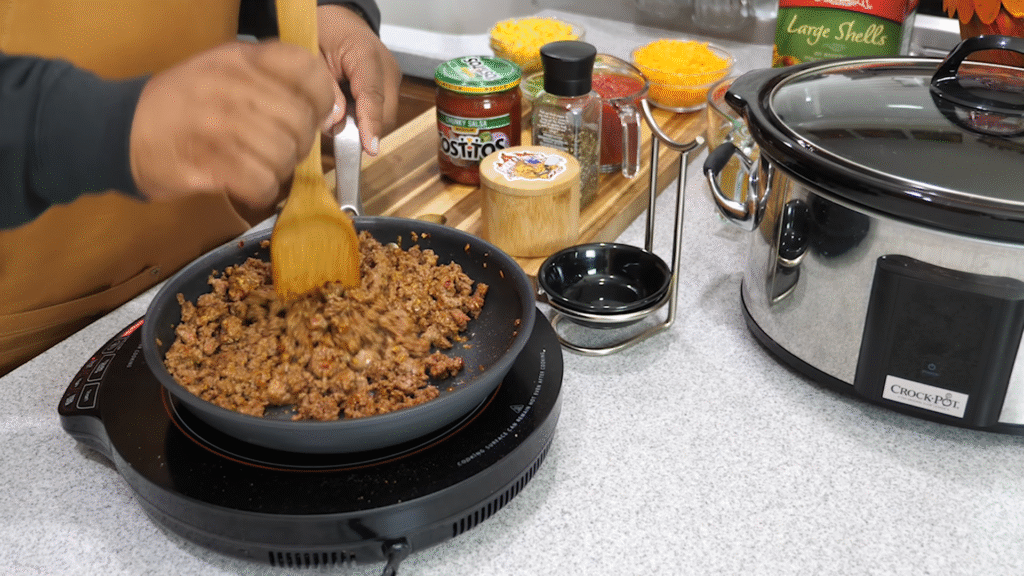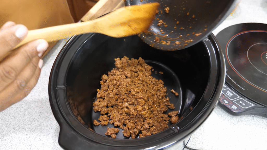 I know this is a slow cooker recipe, but you do need to brown your ground beef or turkey first. Trust me—it’s worth it. Browning adds flavor and keeps the texture just right. Toss in some chopped onion and garlic while you cook the meat.