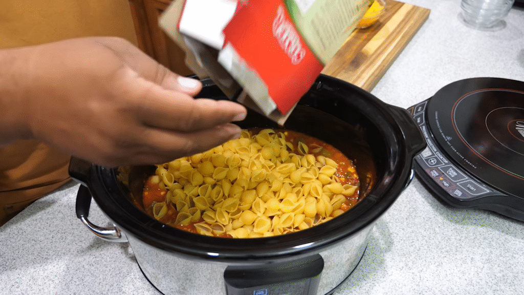 About 30–40 minutes before serving, stir in the uncooked pasta. This is key—don’t add it too early or it’ll turn mushy.