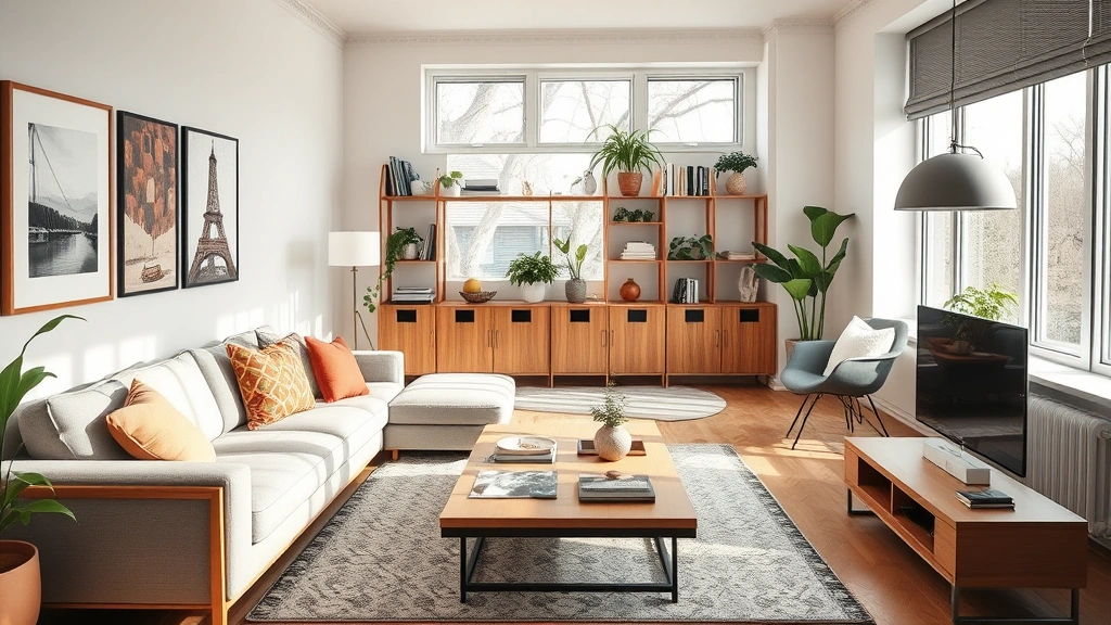 Imagine a cozy, stylish apartment filled with light, featuring multifunctional furniture, clever storage solutions, and vibrant decor.