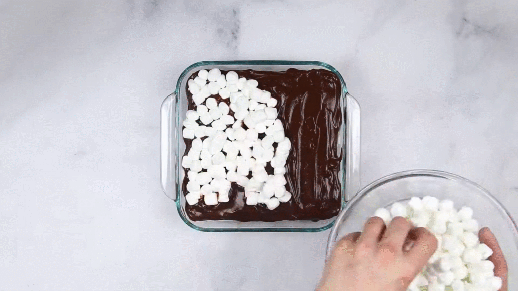 On the final layer, add more whipped marshmallow cream, sprinkle with chocolate shavings, and scatter mini marshmallows on top. For extra fun, lightly toast the marshmallows with a kitchen torch.