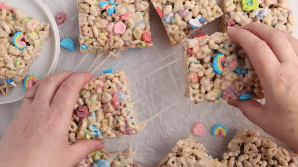 These bars are basically Rice Krispies treats with a magical twist. Instead of rice cereal, you use Lucky Charms. The colorful marshmallows make them instantly festive, and they take less than 15 minutes to make.