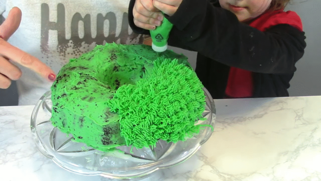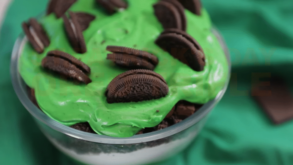 Layer green pudding, crushed Oreos, whipped cream, and candy in a clear cup or bowl. It looks fancy, but it’s super easy to throw together.