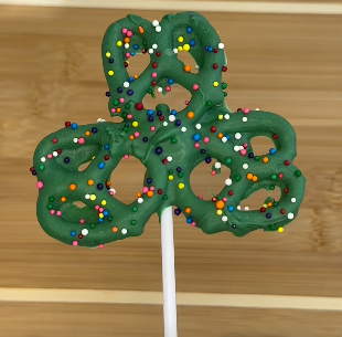 All you need are pretzel twists and melted green candy coating. Arrange three pretzels in a shamrock shape with a stick at the bottom, and you have an adorable sweet-and-salty treat.