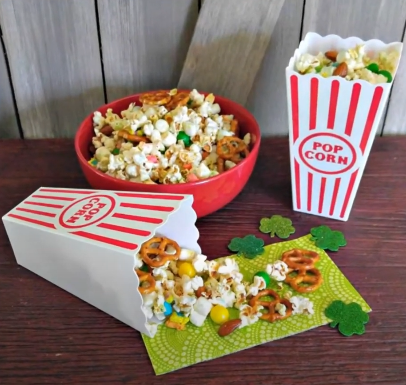 Mix pretzels, popcorn, chocolate candies, and mini marshmallows. Drizzle with green candy coating and toss in some gold-wrapped chocolates.