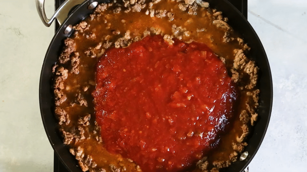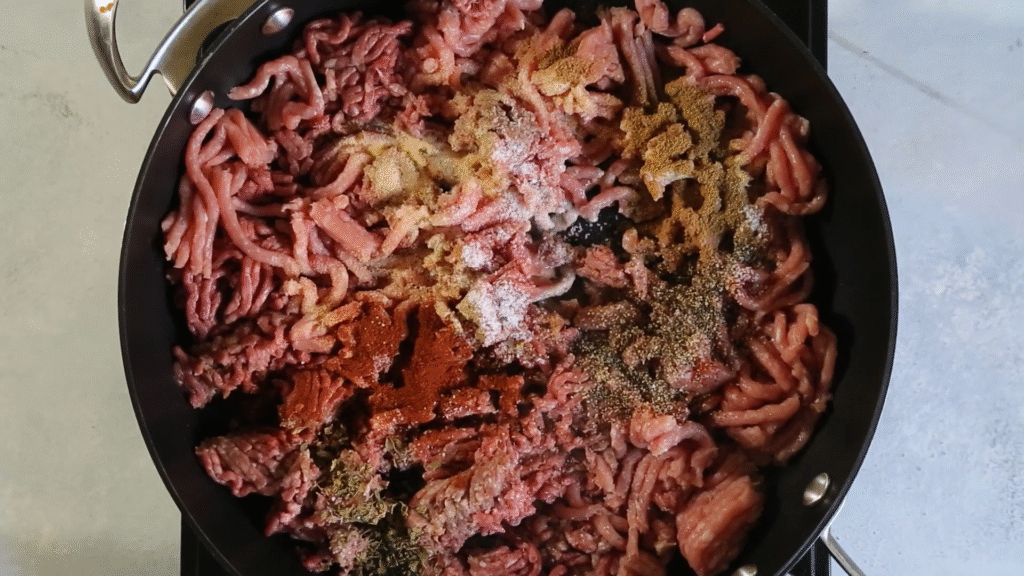 In a large skillet, brown your ground beef until fully cooked. Drain the fat if needed. Add the taco seasoning and a splash of water, stirring until the beef is coated and flavorful.