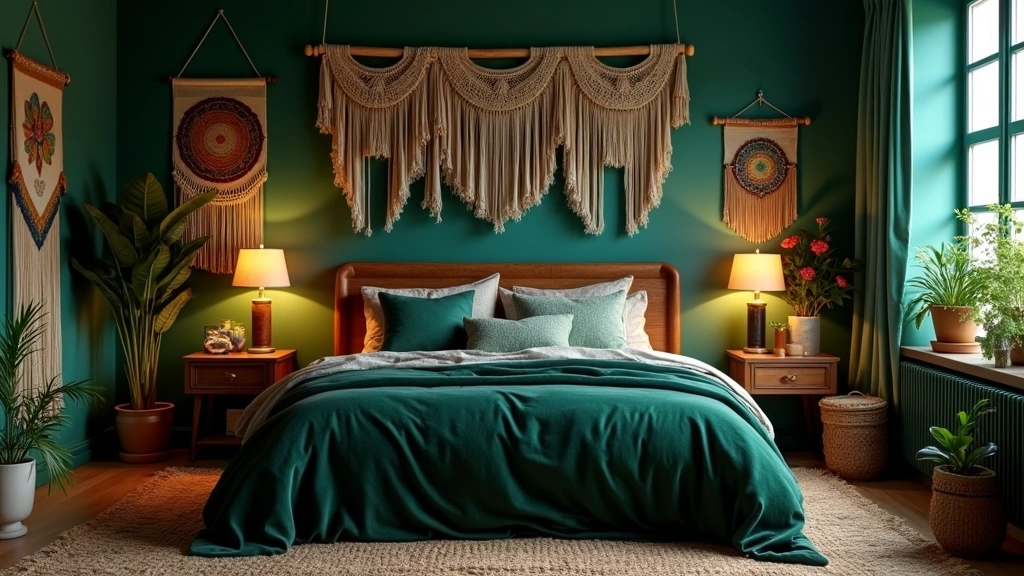 Deep jewel tones like emerald, sapphire, and amethyst bring a rich, luxurious feel to a dark boho bedroom.