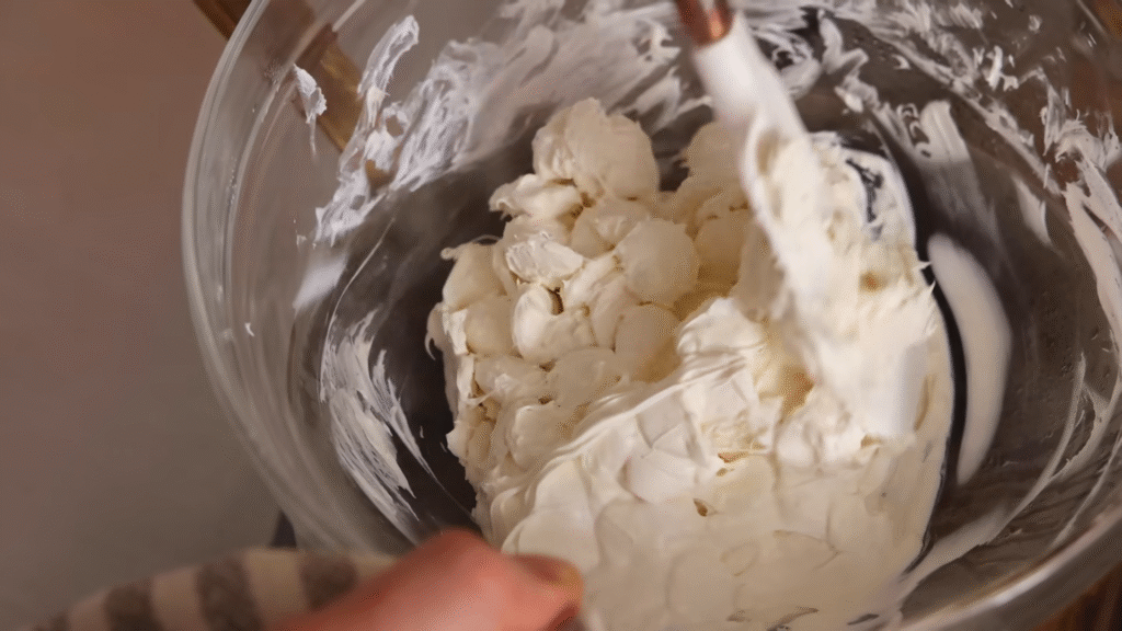 Add a few spoonfuls of cream cheese frosting into the crumbs. Mix until it becomes dough-like and you can roll it into balls. Don’t add too much frosting or they’ll get mushy.