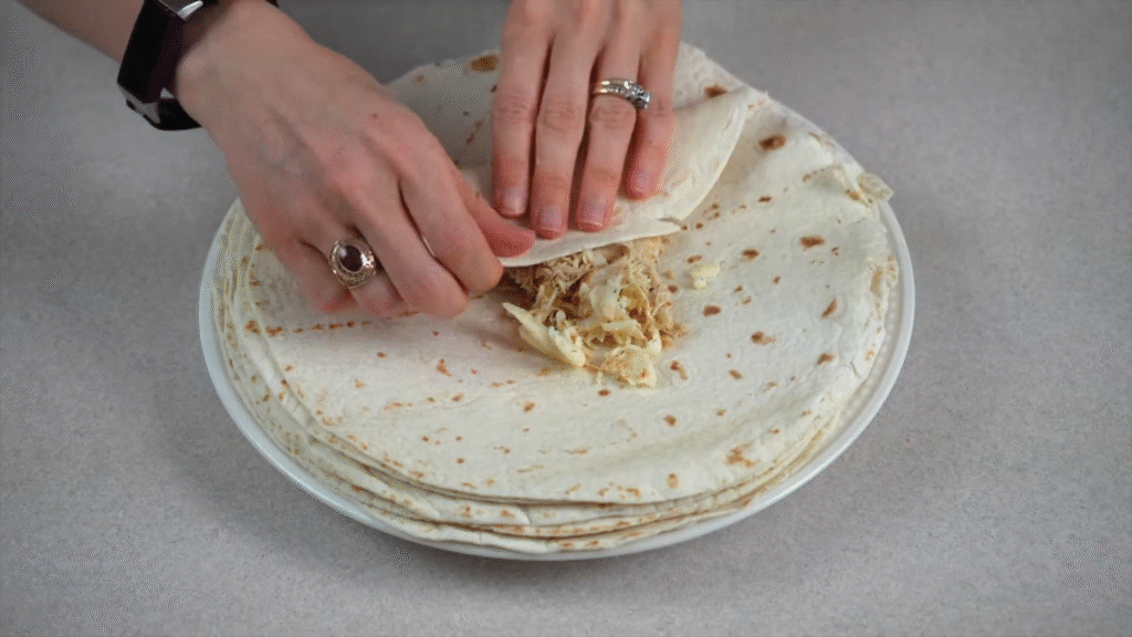 - Warm the tortillas first – Microwave them for 20 seconds so they don’t crack when rolling.