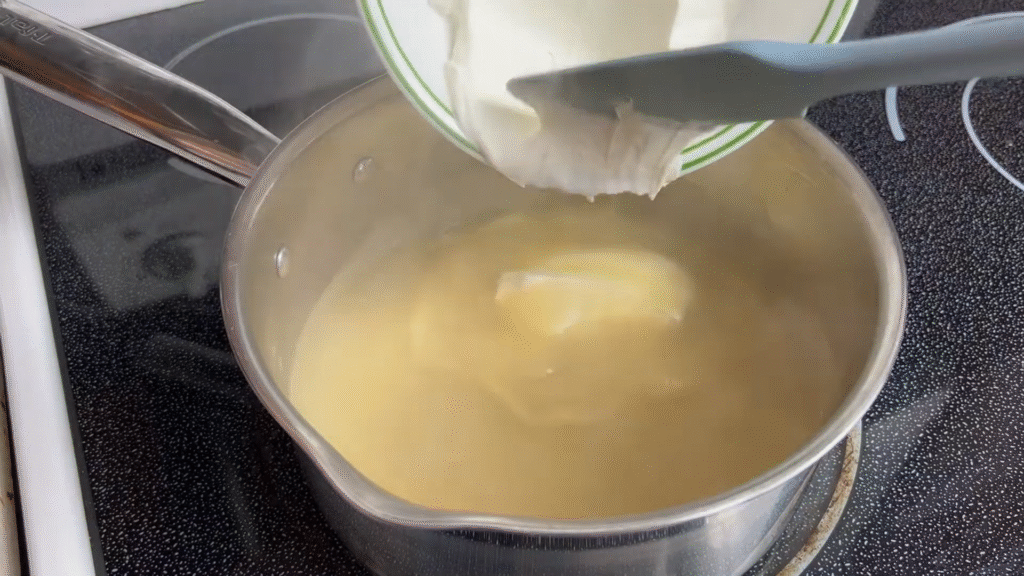 In a saucepan, melt the butter, then whisk in the flour. Cook for 1 minute to remove the raw flour taste. Slowly pour in the chicken broth, whisking until smooth. Let it simmer for a few minutes until it thickens. Stir in the sour cream and green chilies. Season with salt and pepper.